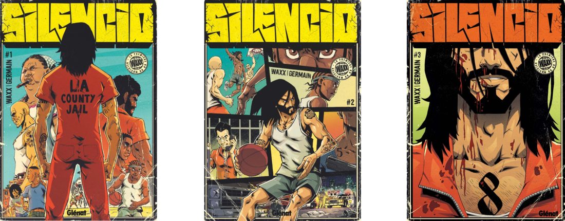Waxx, producteur entre autre de Georgio, Ben L’Oncle Soul et L.E.J et musicien émérite à la reprise facile (que l’on peut voir sur youtube), Waxx signe depuis cette année le scénario de Silencio, série BD dessinée par Gabriel Germain (Lune et L’Autre chez Casterman) qui nous catapulte dans un univers carcéral californien où le terrain de basket d’un pénitencier devient le lieu de rédemption d’un jeune délinquant (dont le physique tatoué, élance et chevelu fait beaucoup penser à Waxx d’ailleurs), le tout publié chez Glénat.