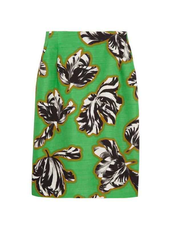 Alors que le printemps s’éveille et que le soleil commence à taper, on opte pour la jupe aux motifs floraux de Jonathan Saunders. Pièce phare de la collection croisière 2014, tout en coton mélangé flammé, elle arbore une coupe simple et une doublure agréable pour garantir un confort total. Parée de grosses tulipes noires et blanches sur fond verre, la jupe Jonathan Saunders se porte avec un basic, un petit pull noir, en talons ou en ballerines. Une petite touche de fantaisie pour rehausser un look sobre et classe.