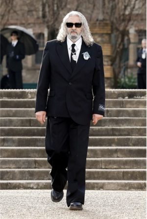 Les parapluies, les sacs cylindriques, les gants, les lunettes noires, les broches : tout participe à cette impression de procession. On ne regarde plus un défilé. On assiste à une marche symbolique. Une communauté réunie autour d’un même souvenir.