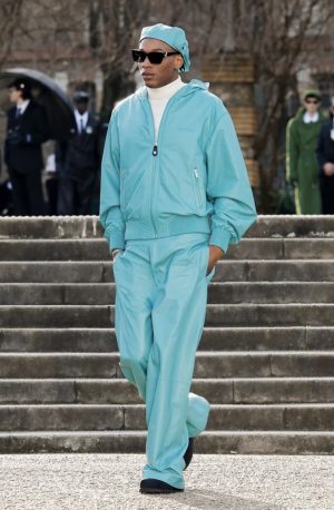 Un total look bleu clair traverse le défilé comme une respiration. Une apparition lumineuse au milieu de cette marche sombre. Comme le moment où la mémoire ne fait plus mal. Où elle devient douce.