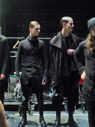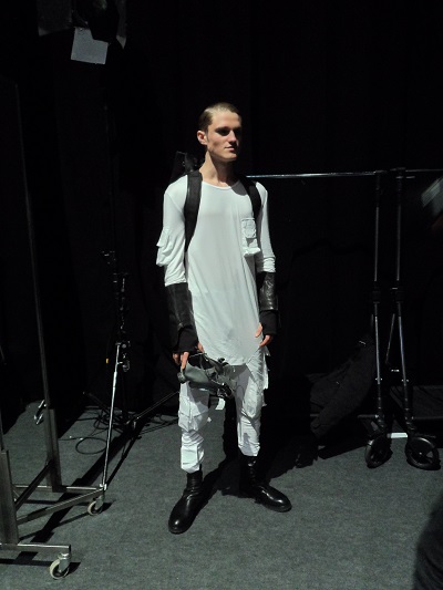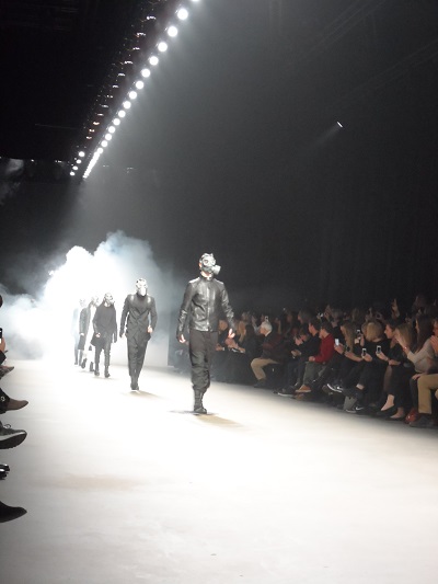 Pourtant, dans les backstages, on se doutait bien que l’ambiance ne serait pas à la joie. En effet, les mannequins défilaient tous avec leur unique accessoire : un scaphandrier. Plongé dans une atmosphère de guerre, des bruits d’os accompagnent les silhouettes déshumanisées… Peignoirs à capuche, poches XXL, mitaines, gants de protection prolongeant une chemise, sac à dos polochon, pantalons et chaussures en cuir,… l’essentiel du vestiaire de Army of Me est noir -sauf exception !