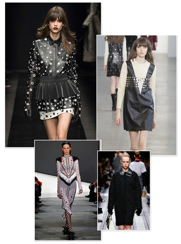 La mode grunge n’est plus destinée qu’à la rue, elle s’invite à présent sur les défilés et dans nos dressings. Ce mouvement, apparut dans les années 70 trouve d’abord son expression à travers la musique avant d’être revendiqué sur le plan vestimentaire. Renversant tous les codes, c’est un style qui se veut propre à lui, mais utilisé consciemment et par touches légères, ces accessoires ou détails métalliques donnent alors un intérêt à notre silhouette. Car attention, l’automne-hiver 2015-2016 sera certes rock, mais chic! Cuir en all over, pantalons lacérés; les clous présents, se font discrets et se muent même en oeillets, notamment chez Emanuel Ungaro ou encore Proenza Schouler. Mais pour ammener cette tendance à points pour les prochains jours d’hiver, on se lance doucement cet été, avec des accessoires décalés, tout droit sortis des années grunge… Piercings chez Christian Dior, épingles à nourrice XXL, sans oublier les anneaux sourciliers de Rodarte. Joli découverte, sur le défilé Manish Arora mis en avant par les accessoires de House Of Malakai qui maximise et assume le côté punk.