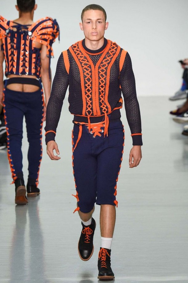 Aujourd’hui, la mode masculine attire tous les regards comme on pu le montrer le succès des derniers défilés même s’il est également dû à la coïncidence des collections Resorts. En parallèle, une nouvelle vague de créateurs propose une autre vision qui challenge les codes du masculin non pas en tombant dans l’androgynie, mais en bien en renversant les normes arbitraires qui régissent le vestiaire masculin. C’est de Londres surtout que viennent ces nouveaux créateurs, Craig Green, Sibling, MAN ou encore Rory Parnell-Mooney. Chacun à leur manière, ils ont su, à travers leurs collections SS16 donner un nouveau souffle au vestiaire masculin à travers de nouveaux codes de virilité que ce soit via des accessoires, de la beauté, un choix de coupes et de couleurs, etc. Le duo Sibling a marqué les esprits avec ‘The dessacration of man subcultures’, une collection inspirée du football américain qui a su exagérer la masculinité du corps à travers les coupes, les épaulettes ainsi que des braguettes aux coutures équivoques rappelant les coques portés par les sportifs les soirs de grand match. « Les hommes s’habillent pour établir leur statut social, mais aussi leur position dans le jeu de séduction et de domination. Épaules larges, buste vaste. Aussi en étant dissimulées les parties sexuelles en devenaient accentuées » nous confirme Ravages.