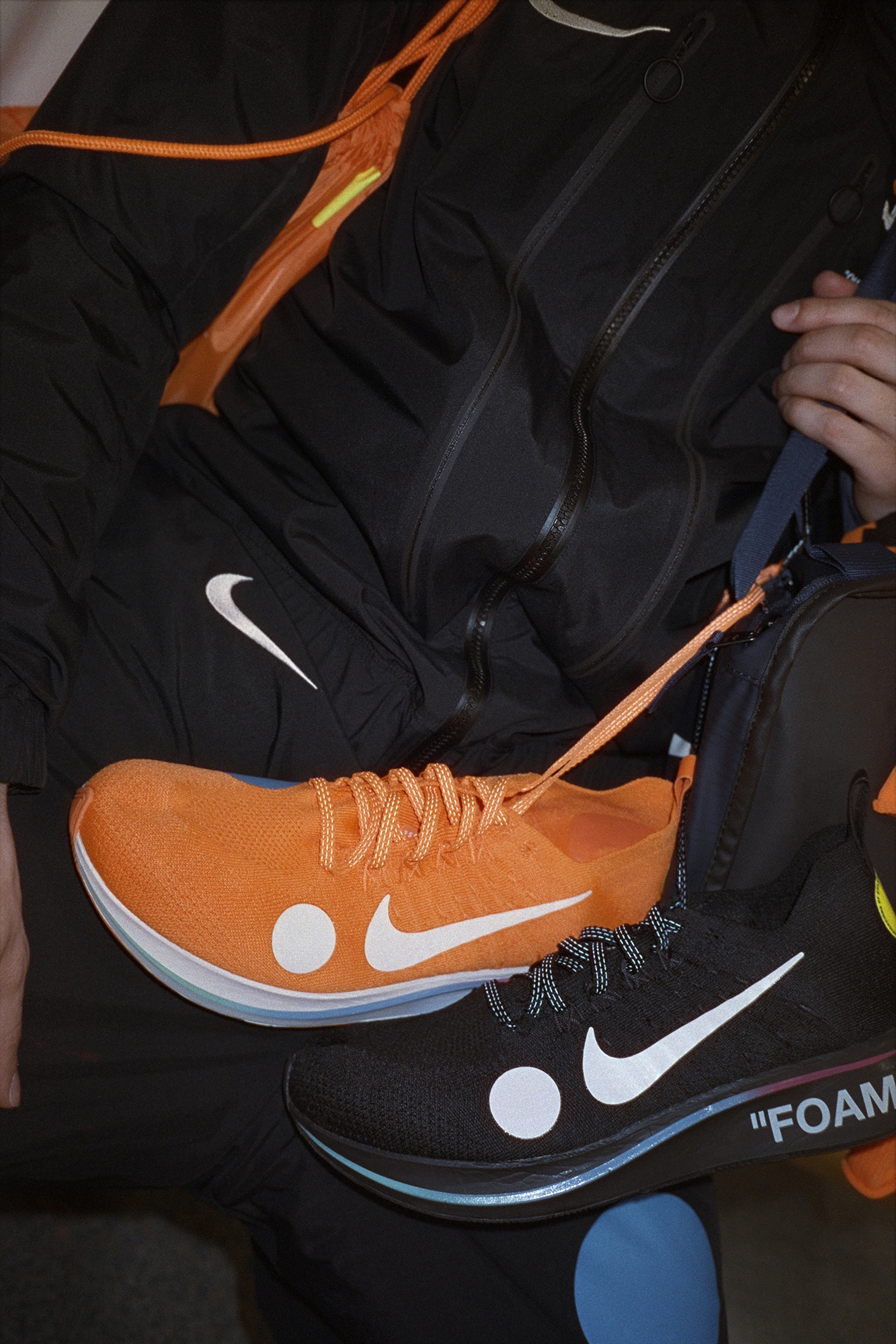 « Je souhaitais montrer l’endroit où un joueur frappe la balle. J’ai donc placé des points sur la chaussure ; lorsqu’il s’agit de frapper une balle, la coordination pied/œil est l’unique paramètre à prendre en compte. C’est comme ça que la collection a démarré, avec ces chaussures de course qui imitent la chaussure de foot sur le terrain, pour pouvoir s’entraîner de manière inconsciente à tout moment. Ensuite, j’ai simplement appliqué cette esthétique à l’ensemble de la collection », explique Virgil Abloh.