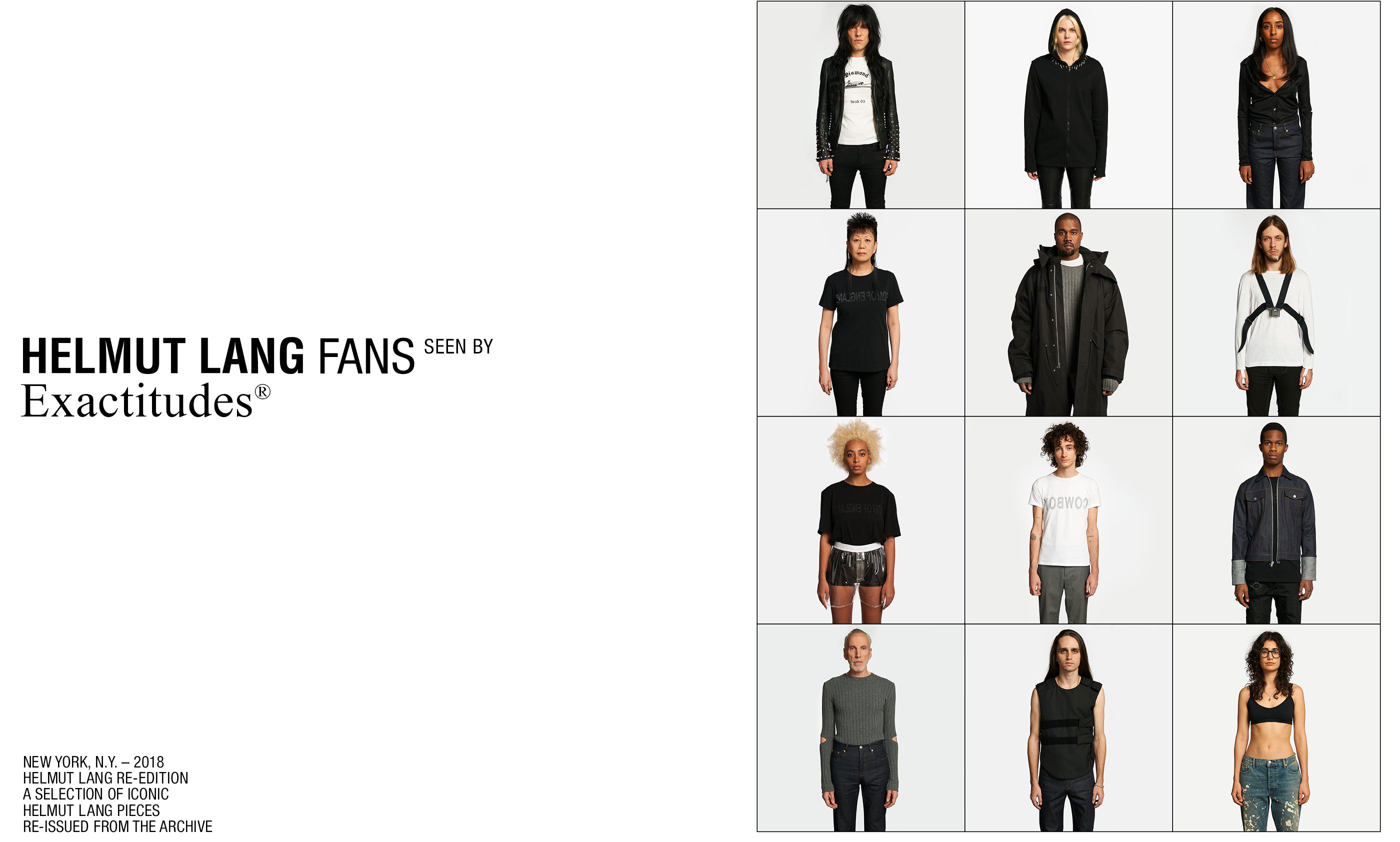 À l’origine, « Exactitudes » s’attelle à immortaliser différents individus venus du monde entier et appartenant à des groupes sociaux similaires. Puis, les visuels rendus sont associés de manière à donner vie à une mosaïque troublante. Le projet commencé en 1994, comporte déjà les séries intitulées « Bimbo », « Gabbers » ou « Yummie Mummies » et renaît de ces cendres aujourd’hui en 2018 avec Helmut Lang. Nommée « HELMUT LANG FANS seen by Exactitudes », la nouvelle mosaïque se compose de visages célèbres tels que Solange et Kanye West et d’inconnus, arborant en toute simplicité les pièces androgynes de la collection Re-Edition.