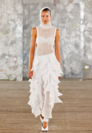 Le show Collina Strada Spring/Summer 2026 s’est déroulé sur un héliport situé au sud de Manhattan. Intitulé The Shadow Behind Us (en français « l’ombre derrière nous »), le défilé explore le thème de la dualité : entre lumière et obscurité, entre ce que l’on porte et ce que l’on cache. Les mannequins défilaient par paires, portant un look identique. Seule différence : la mannequin de droite portait une version noire du look original et marchait juste derrière sa partenaire. La directrice artistique Hillary Taymour justifie cette mise en scène saisissante par une volonté de transmettre un message politique fort, elle explique : « Les pulsions les plus sombres de l’humanité ne se cachent plus dans l’abstraction ; elles prennent forme concrètement ». Une déclaration faisant référence à la situation politique américaine actuelle, où différents droits humains sont remis en question par la présidence Trump. Côté style, Taymour travaille un streetwear chic, avec des jupes ballon et des robes à volants. Un coup de génie qui lui a valu un tonnerre d’applaudissement.