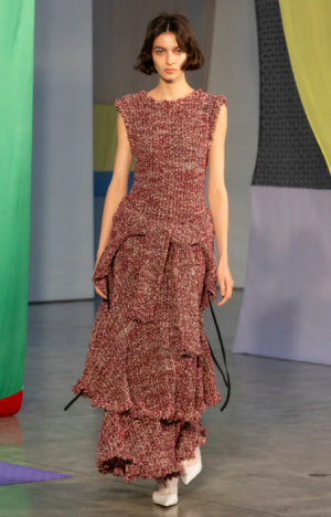 Bilan plus mitigé pour Calvin Klein. Cette saison, Veronica Leoni présentait sa deuxième collection pour la marque avec la responsabilité de mettre en valeur la ligne luxe de Calvin Klein appelée Calvin Klein Collection. L’accent est mis sur un minimalisme moderne et élégant. On a ainsi pu voir sur le catwalk, de jolis ensembles de tailleur légèrement oversize, de longues robes à manche ballon fluide, mais également des pièces plus avant-gardistes comme cette robe blanche à effet froissée. Look par look, les silhouettes fonctionnent : certaines sont simples mais efficaces, d’autres plus mode, sont un peu too much comme ces pompoms accrochés en bas des robes. Néanmoins, la diversité de ces propositions crée un manque de cohérence dans l’ensemble, et la collection finit par être un peu difficile à lire. En tant que nouvelle directrice artistique de la marque, Leoni devrait se concentrer sur le développement d’une esthétique forte, capable de marquer sa signature au sein de la maison Calvin Klein.