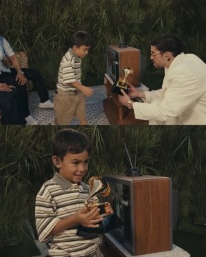 La caméra s’attarde ensuite sur un salon familial : une mère, un père, un enfant regardent son discours des Grammy Awards. En offrant symboliquement son trophée à l’enfant, il opère un passage de relais. Son succès devient héritage. Aussi, l’apparition de Toñita, figure du Caribbean Social Club de Williamsburg, ancre la performance dans l’histoire réelle de la diaspora. Enfin, l’image d’un enfant endormi sur deux chaises au milieu d’un mariage agit comme un symbole intime et universel. Grandir au rythme des fêtes, s’endormir sur des lits improvisés pendant que la musique continue : une scène partagée par des générations entières latino-caribéennes.