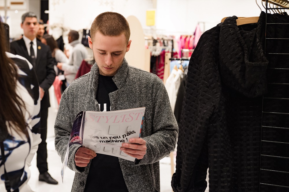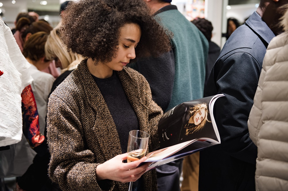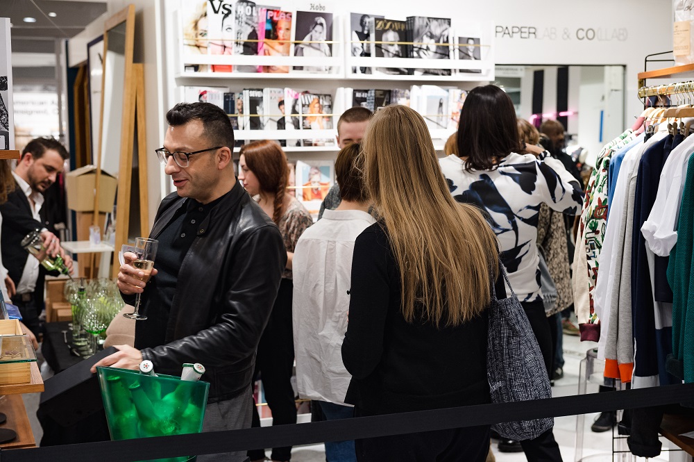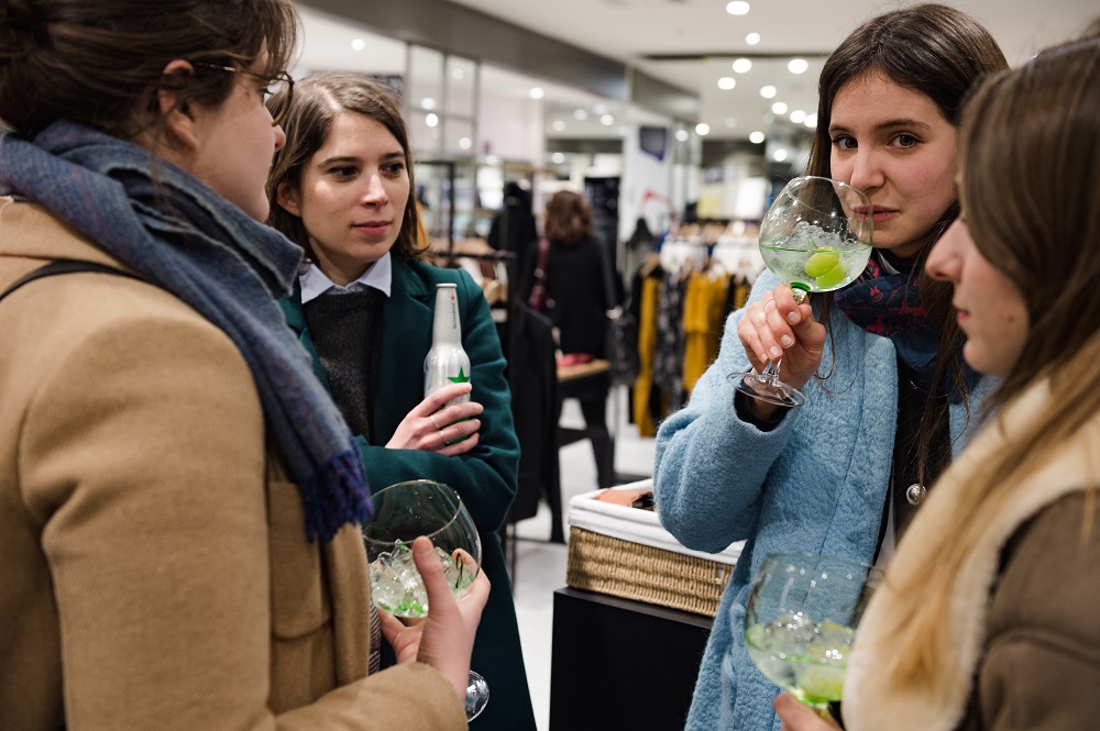 A partir de 19h, ça commence sérieusement à se bousculer, mais ça ne fait rien, l’ambiance est détendue. DJ Doris maitrise le son, en total raccord avec le lieu, entre le petit (!) cocktail de Gin made in France et la fraicheur d’une Heineken*. Ça feuillette, ça discute mode, musique, projets. Les produits inspirent des discussions sur la qualité indiscutable du savoir-faire à la française. On vous le dit : vous aurez beau lire tous les articles du monde sur les marques présentes, rien ne vaut le toucher de la matière.