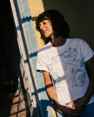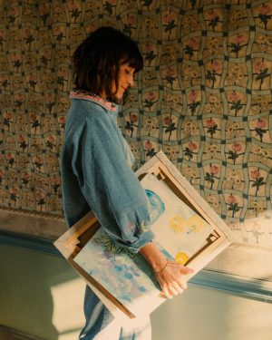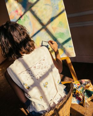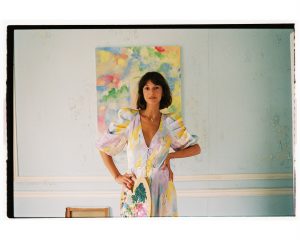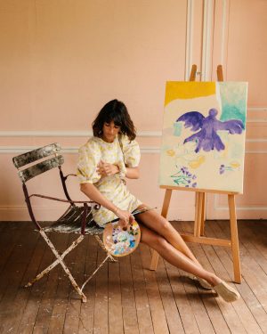 Oeuvre et portrait de Nina Koltchitskaia, robe midi fluide à manches ballons print pastel, Sessùn x Nina Koltchitskaia Une fois de plus Sessùn, très engagée auprès de la création contemporaine, a su dénicher dans l’art la magie qui rend son monde presque illusoire ! Il vous suffit de regarder la robe midi fluide à manches ballons et au print pastel, ne semble t’elle pas sortie d’un tableau conceptuel ? Quant à la blouse blanche à col ajouré brodée de citrons que j’aimerais confits, ils semblent avoir des ailes comme ceux du peintre Romain Burgy ! La robe de coton esprit broderies anglaises, le gilet sans manche en crochet d’inspiration vintage, la veste en jean brodée à la doublure matelassée en patchwork, le jean en denim, la mini jupe ultra féminine, le T.shirt brodé d’une esquisse aérienne, le maillot de bain une pièce dans son imprimé vitaminé, les sabots, le tot bag et le grand bob en canevas viennent compléter ce vestiaire qui nourrira tant votre imaginaire que votre été en sera d’autant plus solaire !