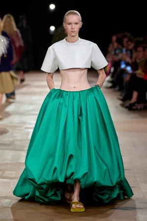 En réaction au minimalisme ambiant, le maximalisme s’est trouvé un allié de poids : la couleur. Chez Akris, un rouge étincelant se mêle à un bleu roi éclatant, tandis que chez Fendi, ce sont des teintes estivales, orange, vert et jaune, qui habillent les jupes et tops avec audace. Mais c’est à Prada que revient la palme d’or, grâce à une parfaite maîtrise de cette tendance haute en couleur, avec des looks tricolores flamboyants qui captivent et dynamisent la silhouette.
