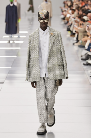 Le défilé tant attendu de Dior Homme prend place à 14:30 à École Militaire. L’obscurité prend place dans le lieu. La lumière s’allume progressivement, des carrés au sol commencent à s’ouvrir automatiquement, puis comme par magie, les modèles situés dans chaque trou montent en surface. Entrée spectaculaire et inattendue. Ils arrivent tels des robots statiques ou soldats au repos en créant trois rangées. Un mannequin commence à ouvrir le bal en marchant puis les autres le suivent un par un. L’ambiance est un mélange entre futurisme et armée. Beaucoup de couleurs fluo et imprimés sont présents dans cette collection. Une fois qu’ils ont fini de défiler, ils disparaissent dans les entrailles de la terre. Entre passé et présent, Kim Jones a vraiment su marquer les esprits en créant un show spectaculaire et insolite en s’inspirant de Gianfranco Ferré qui a su à son tour impressionner les consommateurs avec ses broderies et Marc Bohan avec ses textures emblématiques (deux des anciens directeurs de la maison).