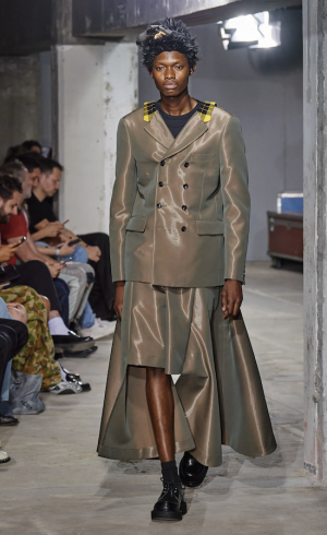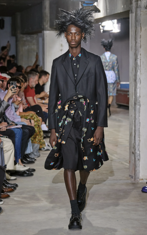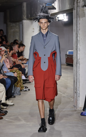 Rei Kawakubo présente sa collection Comme des Garçons Homme Plus à 17:00. Dans cette collection, elle challenge les normes et la réalité. Elle se réinvente en créant des formes plus simples comparé à ce qu’elle fait d’habitude en jouant avec le blazer pour créer un renouveau avec des touches de couleurs. Pour amplifier le côté « altération de la réalité », les cheveux des mannequins sont totalement rocambolesques. Un véritable show en totale adéquation avec l’ADN de la marque.