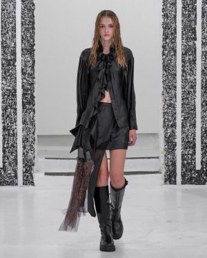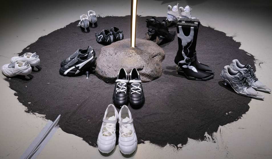 Le Palais de Tokyo accueillait mercredi après-midi, une présentation pas comme les autres, celle de la marque de chaussures chinoise Empty Behavior intitulée Interstellar Sports. Créée en 2022, la marque encore très jeune confirme néanmoins son sens de la mise en scène en inversant le rôle des mannequins avec celui des invité.e.s. Offrant à ces derniers l’occasion de s’emparer du catwalk comme de véritables mannequins. Pour ce qui est de la nouvelle collection, elle est un alliage entre les kitten heels, les crampons de football et les baskets de course. Ornées de détails réfléchissants, les chaussures placées en cercle sur du sable noir renvoyaient, au gré des flashs des appareils photo, des scintillements interstellaires. (Julie Boone)