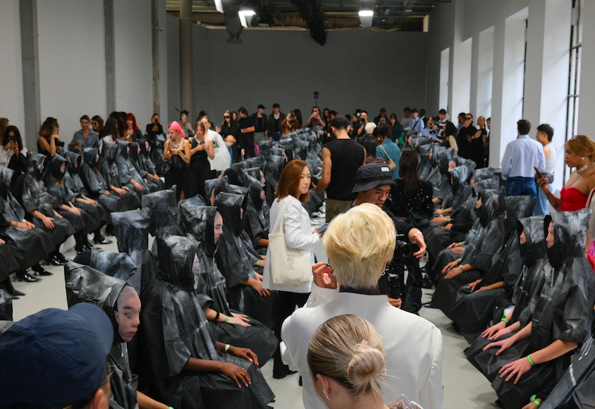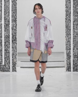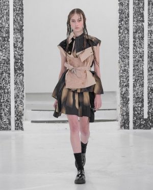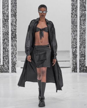 Au coeur du marais, dans un décor aux allures de studio photo, Chenxuan Zhang dévoile sa collection printemps/été 2024. Intitulée To Know You, le créateur puise son inspiration dans l’épisode Le pouls brutal de la Machine issu de la série Love, Death & Robots. La collection s’articule autour du lien qui existe entre l’homme et la technologie. Les silhouettes sont déstructurées et les codes du vêtements sont redéfinis. Dans un dégradé de noir, de kaki et de marron, les chemises se combinent avec des corsets, les manteaux deviennent des robes et les jupes fusionnent les longueurs. Au rythme d’une compilation de musique classique, les mannequins défilent d’un air nonchalant, avant de prendre place au centre de la pièce. Dans un canapé, les modèles prennent la pose devant 16 artistes venus du monde entier. L’objectif est de capturer leur vision et leur interprétation de cette collection afin de les exposer tout au long de la présentation. À travers cet évènement, Chenxuan Zhang a réussi à faire vivre en harmonie la mode, l’art et la musique. (L.L)