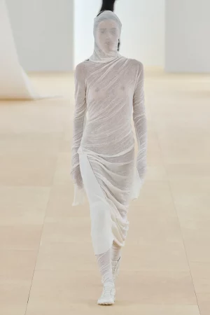 Pour ce 5 ème jour de fashion week, Issey Miyake dévoile sa collection printemps/été 2024 dans l’espace Césure à Paris. La collection intitulée Grasping the Formelss, représente les éléments de la nature qui n’ont pas de forme définie comme le vent et la lumière. C’est ainsi que dans une alchimie saisissante, les danseurs de la troupe de Némo Flouret, les musiciens du groupe ICTUS et les mannequins se partagent la scène. Les silhouettes introduisent une esthétique novatrice et résultent de techniques de tissages spécifiques. Pour donner du mouvement aux vêtements, Satoshi Kondo utilise des fibres naturelles comme le papier washi japonais ou encore le lin. Les robes drapées en forme de tube, les manteaux volumineux, les ensembles torsadées et les jupes scintillantes témoignent du savoir-faire de la maison japonaise. Aux pieds, les mannequins défilent avec la basket MT100, future collaboration entre Issey Miyake et New Balance. (Laura Londas)