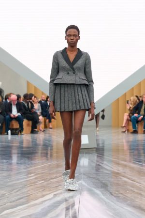 Le défi était tout aussi ambitieux pour Matthieu Blazy, qui présentait le 6 octobre son premier défilé pour Chanel. Comme chez Dior, la scénographie a joué un rôle clé. Fidèle à la tradition de la maison, le défilé s’est tenu au Grand Palais, plongé cette fois dans une ambiance cosmique : les mannequins défilaient autour de représentations monumentales de Vénus, Mars et Pluton. Blazy s’inscrit dans la lignée de Karl Lagerfeld en proposant un décor spectaculaire, tout en établissant un dialogue symbolique avec Coco Chanel. Sa collection est pensée comme une conversation avec la fondatrice, remplie de références aux archives de la maison. On retrouve un important travail de tailoring : des tailleurs-jupes légèrement oversize, des silhouettes androgynes évoquant l’intérêt de Chanel pour le vestiaire masculin, et un tweed en trompe-l’œil, non pas tissé, mais conçu en maille stretch boutonnée. Le tout compose un vestiaire pensé pour les femmes modernes, tel que Gabrielle Chanel aurait pu l’imaginer. Le défilé a été salué par la critique, notamment lors de son final vibrant : le mannequin Awar Odhiang, tout sourire, a clôturé le show en frappant dans ses mains sous les applaudissements.