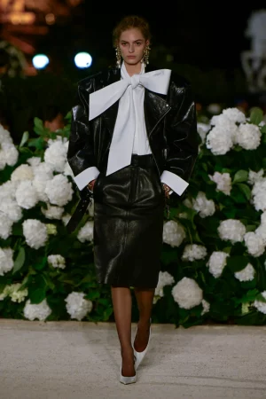Dans un climat de changement, certaines maisons ont choisi de revenir à leurs fondamentaux. C’est le cas d’Yves Saint Laurent, dirigée depuis neuf ans par Anthony Vaccarello. Le créateur belge s’est inspiré d’une archive retrouvée récemment, dans laquelle Françoise Giroud, ex-ministre de la Culture dans les années 1970, décrivait la femme Saint Laurent comme une « comtesse de la nuit ». Vaccarello a puisé dans cette image pour construire un vestiaire à la fois chic et rebelle, fidèle à l’essence de la maison. Le défilé a révélé des vestes en cuir épais à manches ballon, portées avec des chemisiers blancs en popeline ornés de nœuds papillon lâches, ou encore des trench-coats à col montant. Présenté, comme souvent, au pied de la Tour Eiffel, le show ancre encore une fois l’identité Saint Laurent dans un Paris à la fois intemporel, mystérieux et libre. Face au tumulte ambiant, Vaccarello semble avoir choisi de maintenir le cap : revenir à l’ADN de la maison plutôt que de céder aux sirènes de la nouveauté à tout prix.