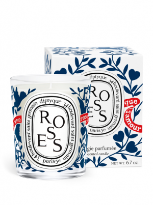Pour la Saint-Valentin, l’artiste Constantin Riant (connu notamment pour son travail avec la marque Longchamp) a apporté sa fameuse touche de bleu dans l’univers de Diptyque, ornant la bougie Roses d’hirondelles, branches et fleurs. Un message apparaît toutefois sur une bandelette au fond rouge : « Le cœur est une rose que l’amour fait éclore ».