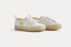 La collaboration entre Superga et Forte_Forte donne naissance à deux modèles ornés avec l’emblématique patch cœur en crochet dans des couleurs claires et pastel, avec un monogramme f_f fluorescent. La languette et la boucle à l’arrière fabriquées en coton sont personnalisées avec la broderie du logo forte_forte. La semelle traditionnelle en caoutchouc naturel vulcanisé est translucide et développée en deux tons: semi–transparente pour la version blanche et ambrée pour la version organique. Les lacets en coton naturel sont blancs pour compléter l’allure easy chic.