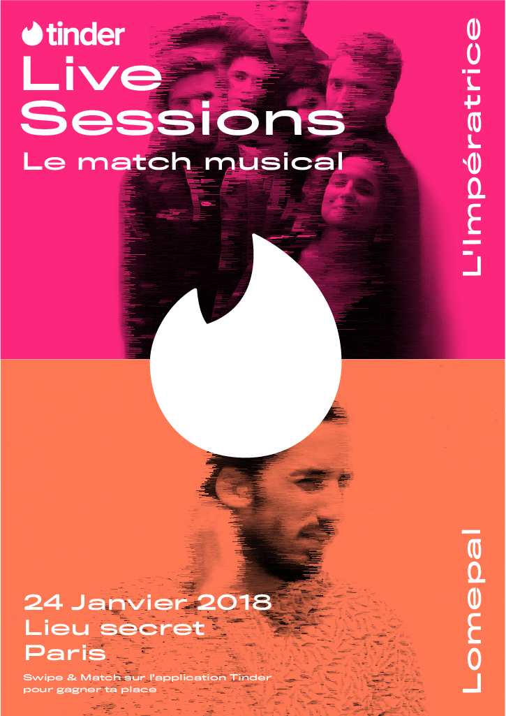 Initiative sympathique de We Love Art qui s’associe avec Tinder pour monter les Tinder Live Sessions (soirées musicales avec des artistes live sur invitation seulement). La prochaine session aura lieu le mercredi 24 janvier dans un lieu tenu secret où vous pouvez gagner votre invitation en utilisant l’appli Tinder : il suffit de chercher et matcher avec le profil “TINDER LIVE SESSIONS”. Quand aux artistes qui se produiront sur cette date, il s’agit de L’Impératrice et Lomepal qui se livreront à une sorte de « match musical » : quoi de mieux de faire des rencontres sexy lors d’une soirée musicale de qualité ?