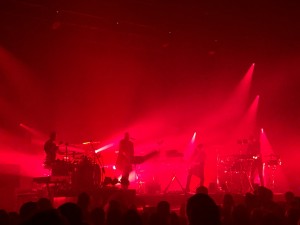 C’est ensuite au tour de Benjamin et Guillaume, les deux compères de The Shoes, de prendre possession de la scène de l’Olympia. Dès le premier titre les visuels ultra drôle de Dent de Cuir -projetés sur un écran XXL allongé- ajoutent une dimension unique à leur musique déjà pourtant des plus énergique. Même s’ils ont beaucoup d’invités sur leurs albums, c’est Benjamin qui assure les vocaux des premiers titres mais voici que Sage les rejoint pour plusieurs titres : le mariage des synthés et de sa voix avec l’énergie incroyable du duo fait vraiment merveille : le public est à fond, totalement acquis à la cause du groupe visiblement en liesse. Premier moment assez dingue sur le bombesque « Drifted » où le public a explosé ! En outre les deux comparses feront un clin d’oeil à Bowie avec une mini-intro de « Lets’ Dance » en version complément revisitée. Ensuite on a la belle surprise de voir Thomas Azier monter sur scène : totalement habité, son univers se fond parfaitement avec celui du groupe et on a un vrai moment de bravoure le tout dans une atmosphère des plus rougeoyante émaillée de vocaux hauts perchés du chanteur. Encore quelques titres où l’on voit l’Olympia littéralement sauter en l’air comme il est rarement de coutume : le sol lui-même renvoyait d’impressionnantes vibrations !