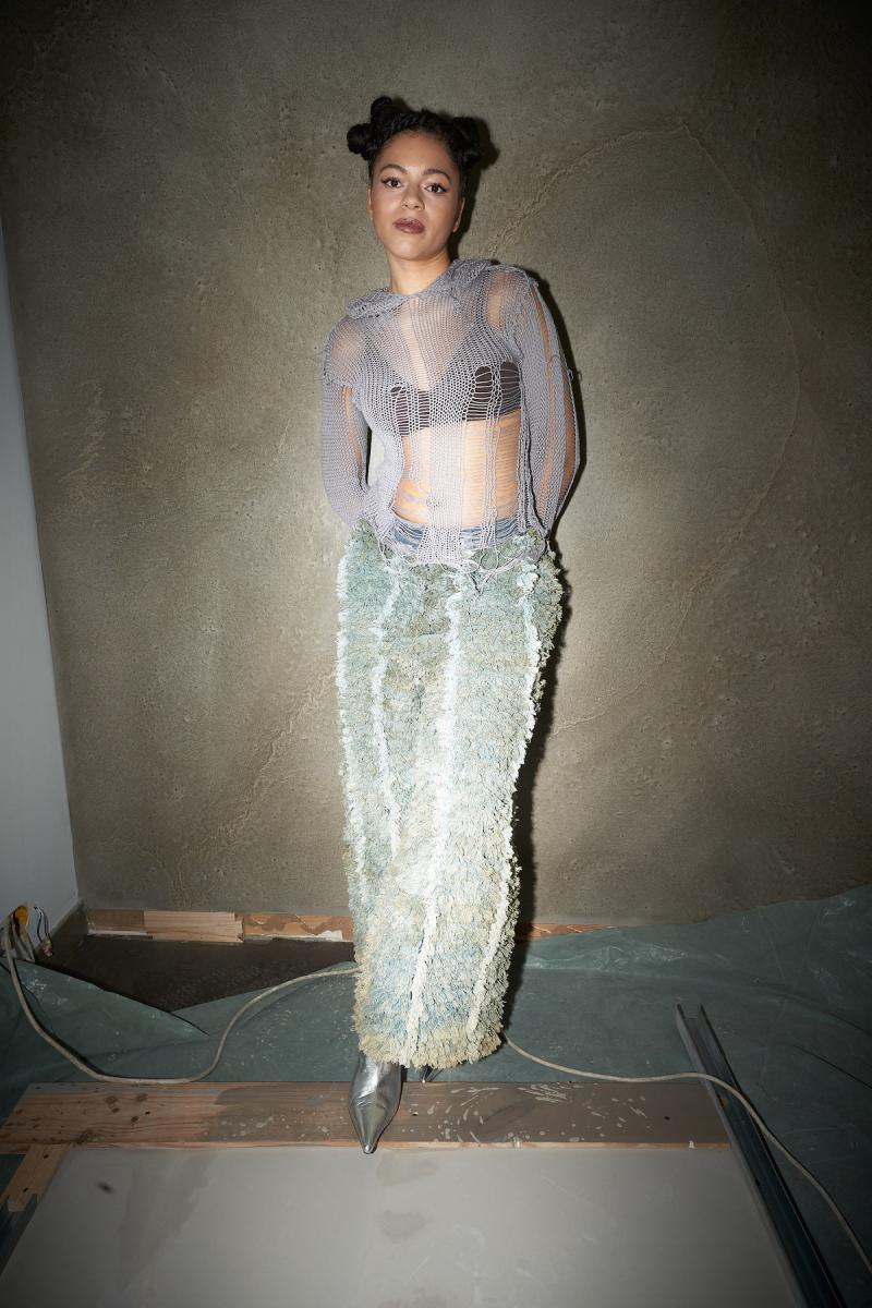 Nectar Woode porte une veste H&M ÉDITION, une chemise LEVI’S, une jupe H&M ÉDITION, des